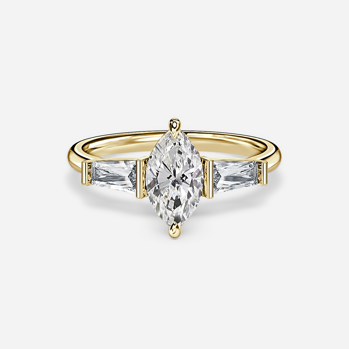 BROWSE READY TO SHIP RINGSA yellow gold three stone engagement ring is held in a classic four-prong setting and accented by 0.30ct two tapered baguette diamonds. Handcrafted in Hatton Gardens, London. Centre Diamond Not Included Setting Only