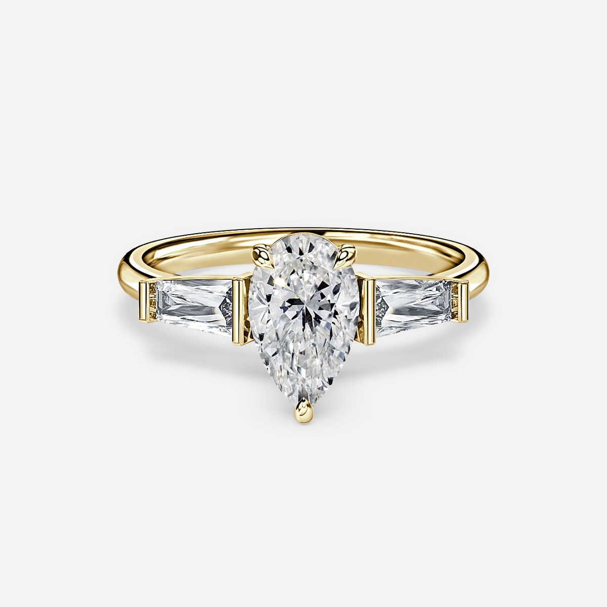 A yellow gold three stone engagement ring is held in a classic four-prong setting and accented by 0.30ct two tapered baguette diamonds. Handcrafted in Hatton Gardens, London. Centre Diamond Not Included Setting Only