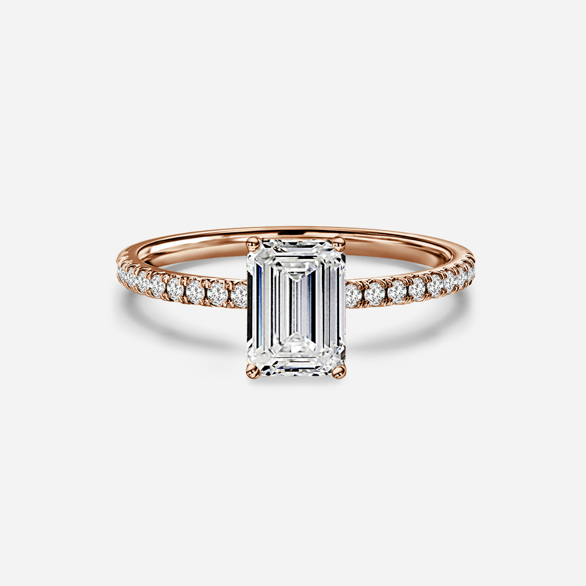 A classic Jessica engagement ring crafted in timeless rose gold showcase a center diamond. Supported by four prongs and pavé-set diamonds. Handcrafted in Hatton Garden, London Centre Diamond Not Included Setting Only