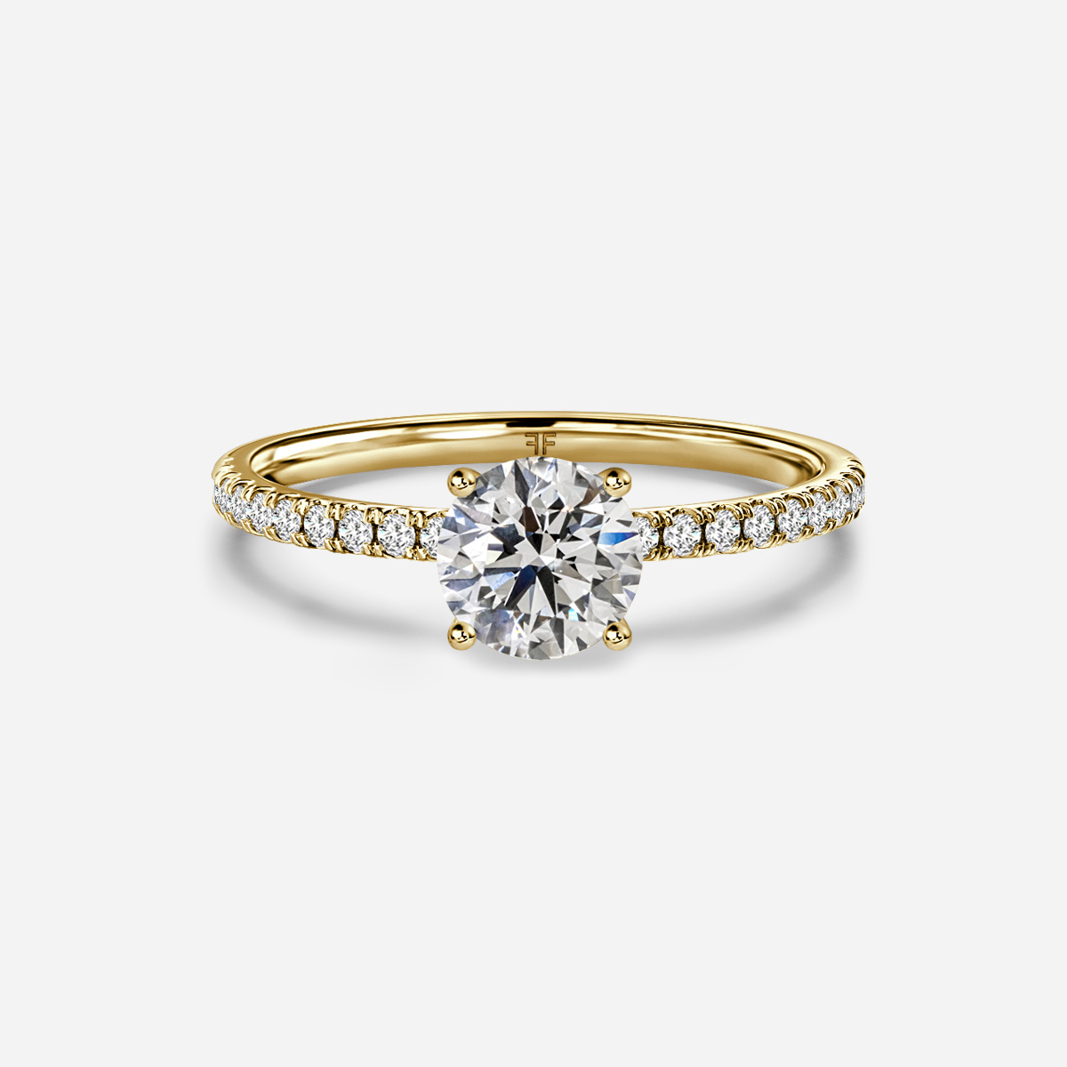 A classic Jessica engagement ring crafted in traditional yellow gold, showcase a center diamond. Supported by four prongs and pavé-set diamonds. Handcrafted in Hatton Garden, London Centre Diamond Not Included Setting Only