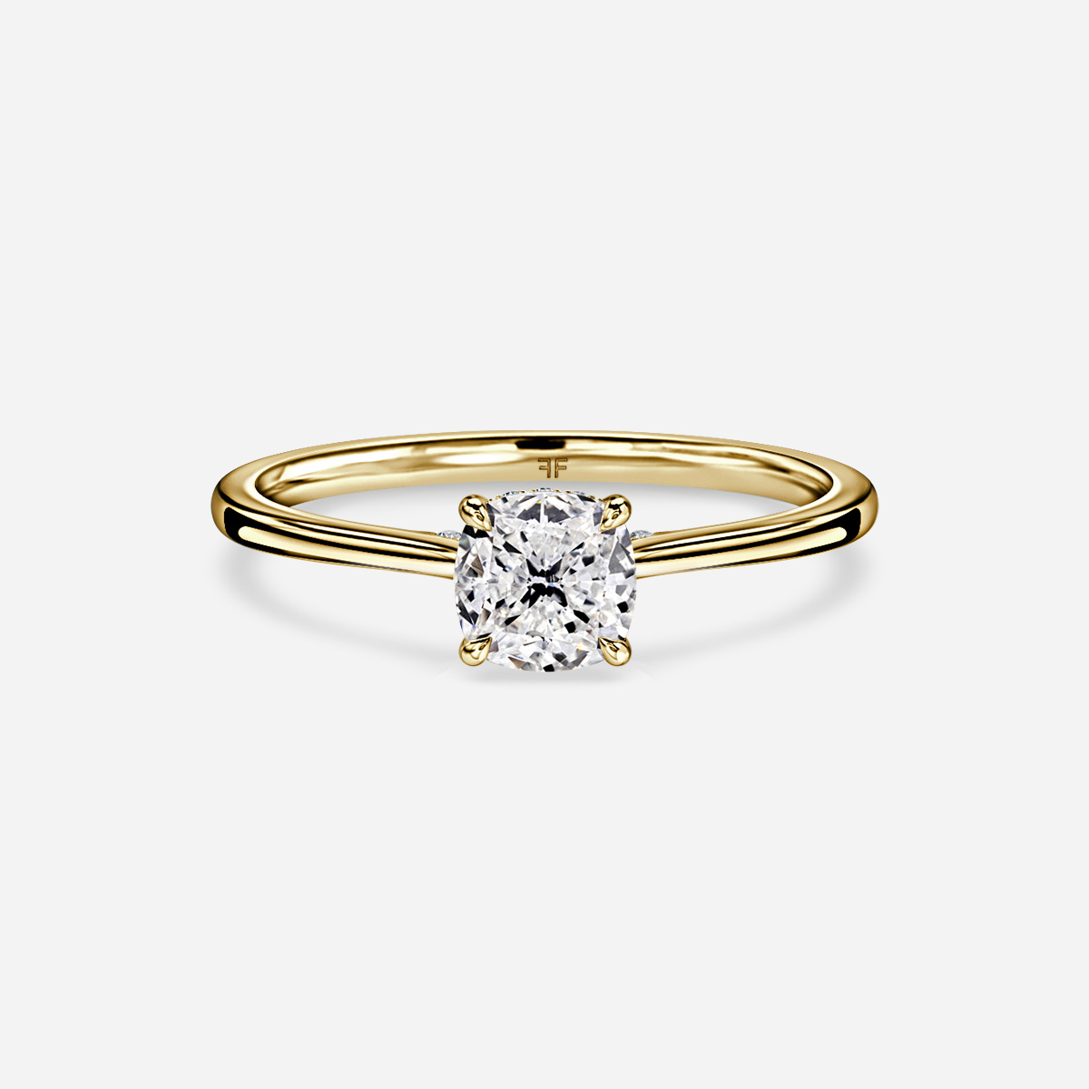 The Juliette Yellow Gold Engagement Ring embodies understated sophistication, showcasing a meticulously crafted hidden halo design with a set bridge. This exquisite ring presents a stunning array of diamonds, epitomizing timeless elegance and refined beauty.