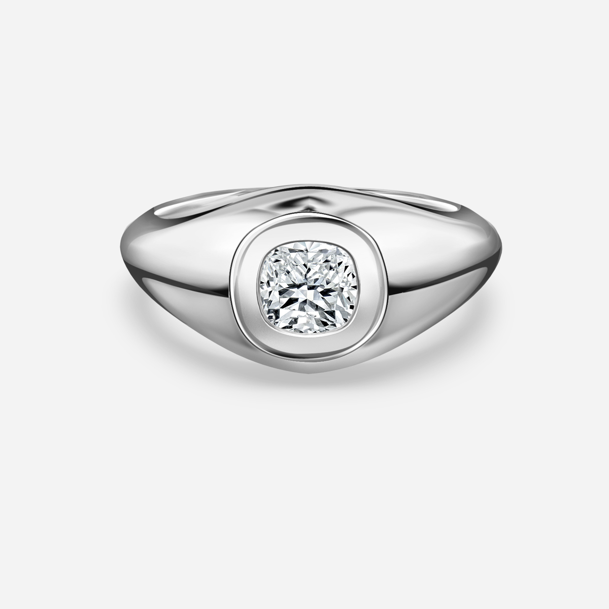 This platinum men engagement ring features a bezel set centre stone within a setting for a unique look, this ring’s strong contours and clean lines rethink the traditonal forms of the signet style. Handcrafted by our master jewellers in Hatton Gardens, London. Centre Diamond Not Included. Setting Only.