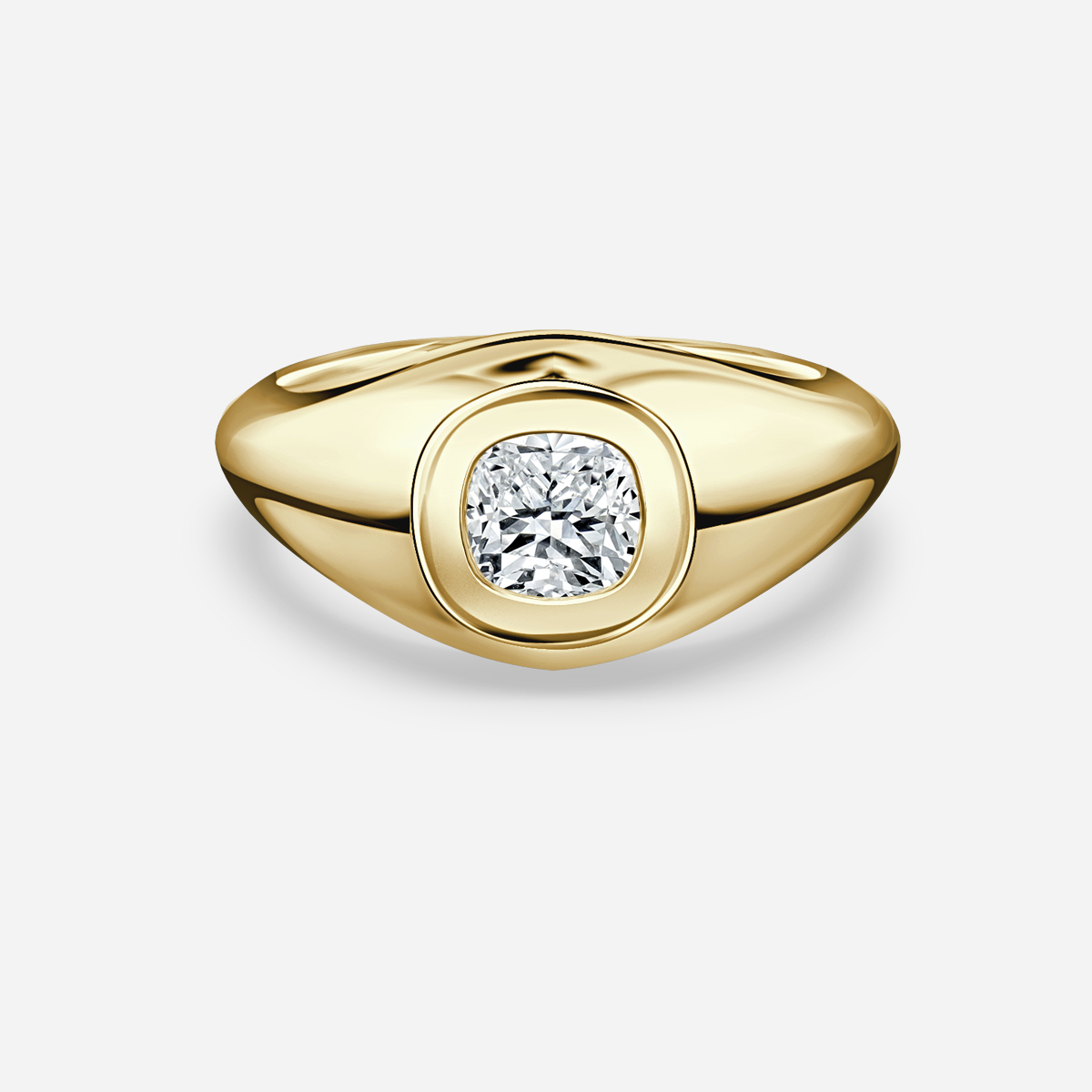 This yellow gold men engagement ring features a bezel set centre stone within a setting for a unique look, this ring’s strong contours and clean lines rethink the traditonal forms of the signet style. Handcrafted by our master jewellers in Hatton Gardens, London. Centre Diamond Not Included. Setting Only.