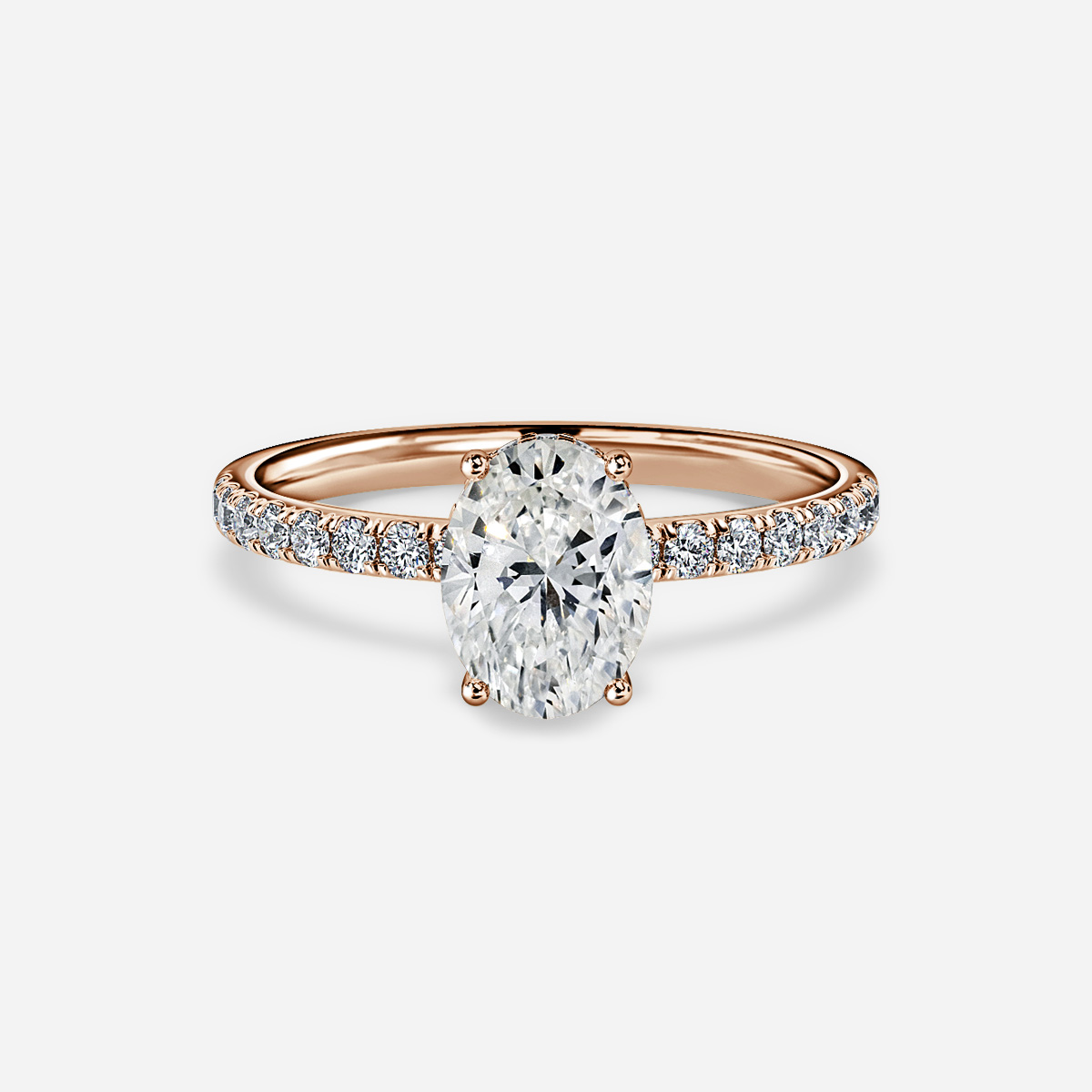 The Kate Rose Gold Pave Band Hidden Halo Engagement Ring features a dazzling rose gold band adorned with delicate pavé-set diamonds, highlighting its timeless elegance. A hidden halo encircles the center stone, adding a subtle yet stunning sparkle from every angle. Handcrafted in Hatton Garden, London. Center Diamond Not Included Setting Only.