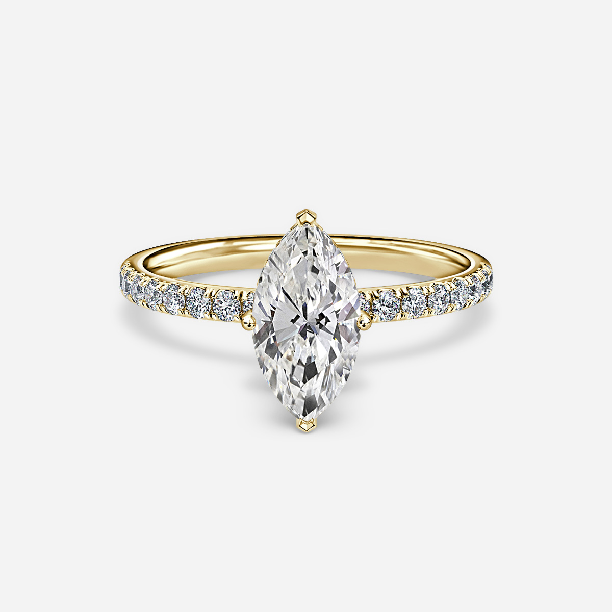 The Kate Yellow Gold Pave Band Hidden Halo Engagement Ring features a dazzling yellow gold band adorned with delicate pavé-set diamonds, highlighting its timeless elegance. A hidden halo encircles the center stone, adding a subtle yet stunning sparkle from every angle. Handcrafted in Hatton Garden, London. Center Diamond Not Included Setting Only.