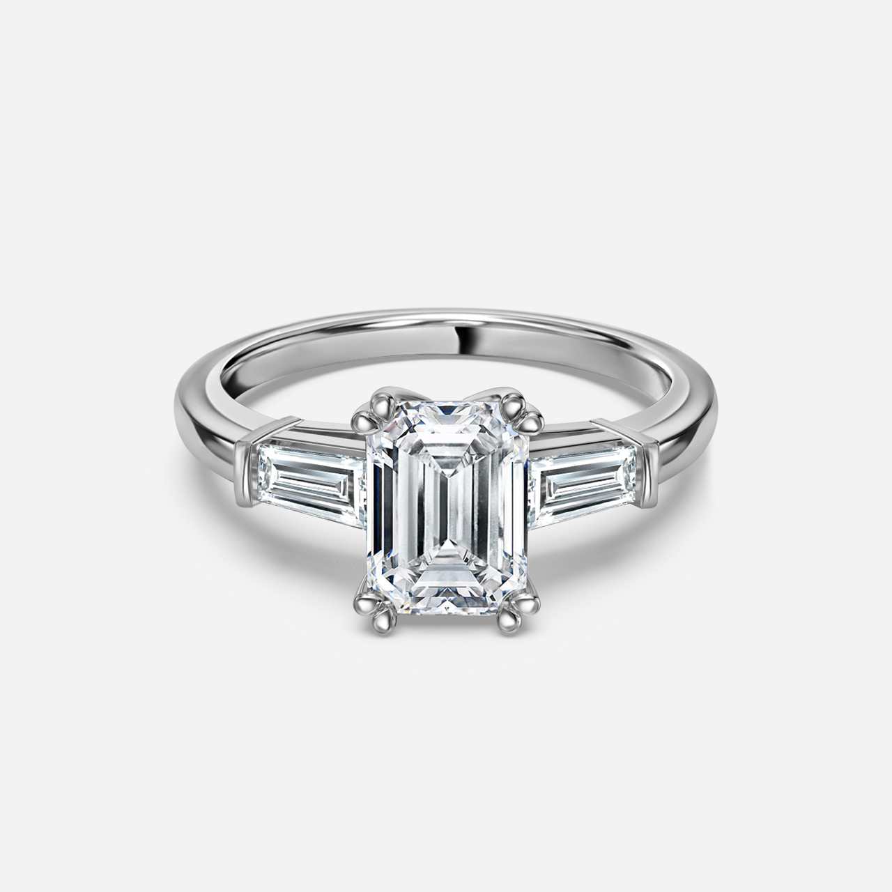 This beautiful platinum trilogy engagement ring is crafted with two tapered baguettes diamond sides and a hidden halo of sparkling diamonds. It is the perfect ring to signify a special and everlasting bond between two people. Handcrafted in Hatton Gardens, London. Centre Diamond Not Included Setting only