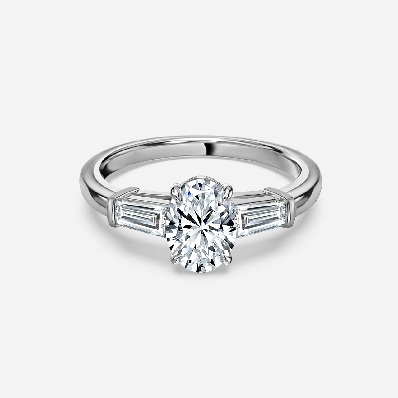 This beautiful platinum trilogy engagement ring is crafted with two tapered baguettes diamond sides and a hidden halo of sparkling diamonds. It is the perfect ring to signify a special and everlasting bond between two people. Handcrafted in Hatton Gardens, London. Centre Diamond Not Included Setting only