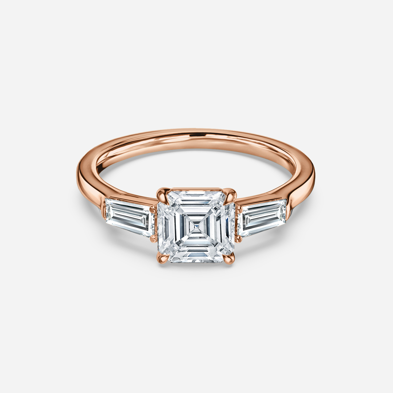 This beautiful rose gold trilogy engagement ring is crafted with two tapered baguettes diamond sides and a hidden halo of sparkling diamonds. It is the perfect ring to signify a special and everlasting bond between two people. Handcrafted in Hatton Gardens, London. Centre Diamond Not Included Setting only