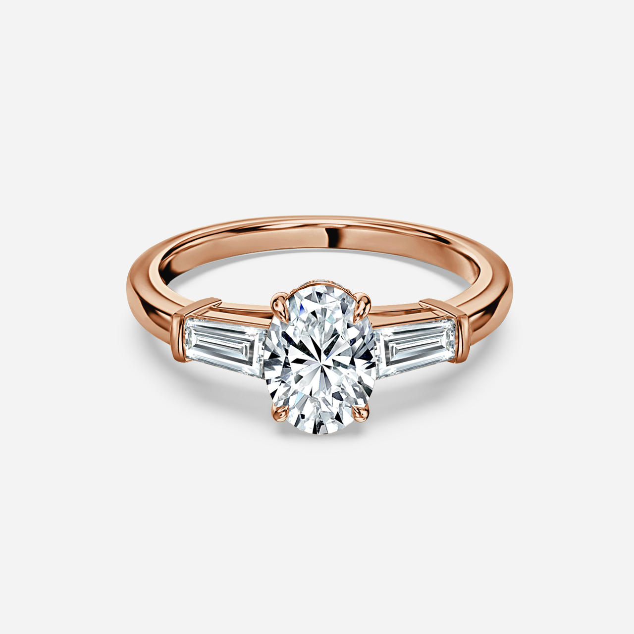 This beautiful rose gold trilogy engagement ring is crafted with two tapered baguettes diamond sides and a hidden halo of sparkling diamonds. It is the perfect ring to signify a special and everlasting bond between two people. Handcrafted in Hatton Gardens, London. Centre Diamond Not Included Setting only