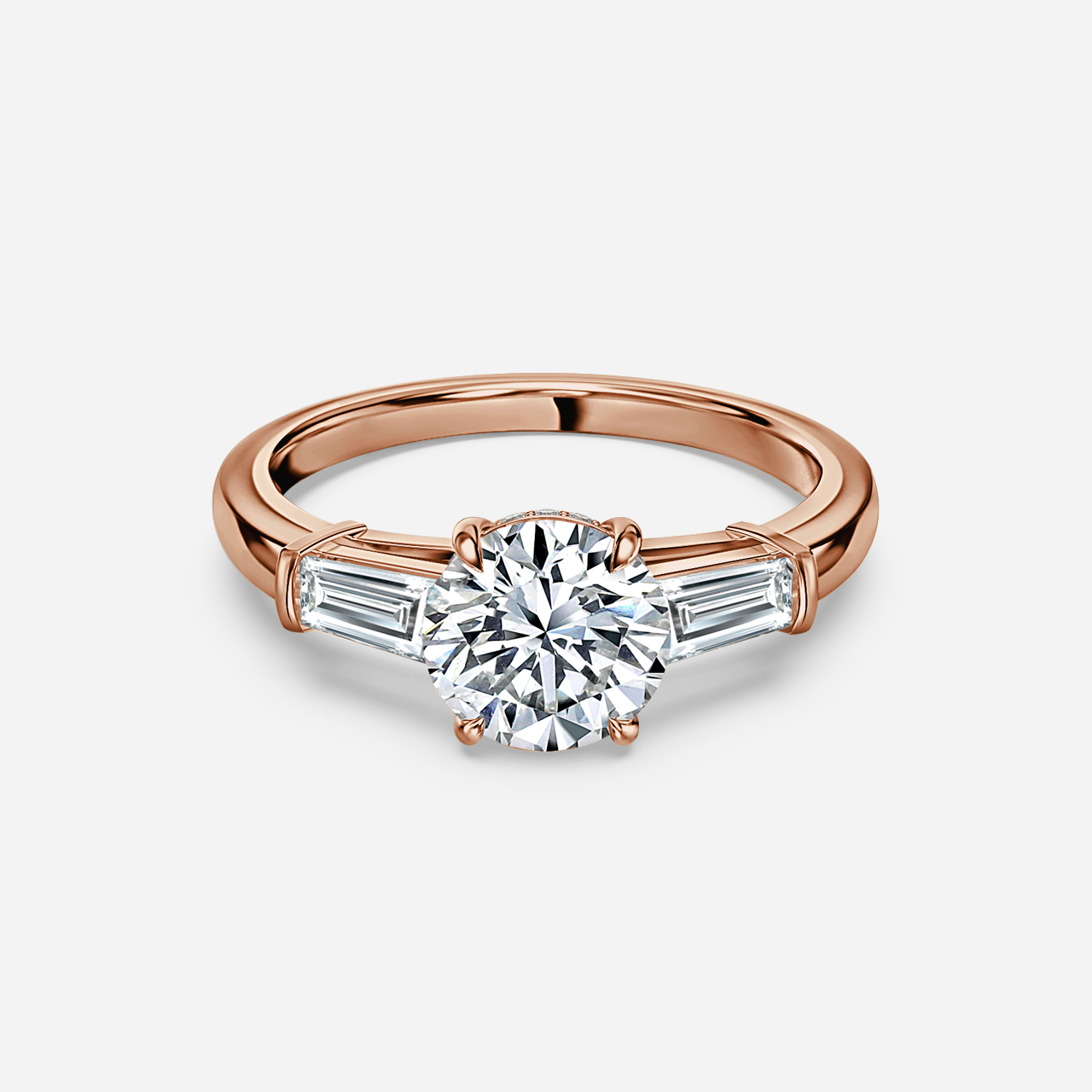This beautiful rose gold trilogy engagement ring is crafted with two tapered baguettes diamond sides and a hidden halo of sparkling diamonds. It is the perfect ring to signify a special and everlasting bond between two people. Handcrafted in Hatton Gardens, London. Centre Diamond Not Included Setting only