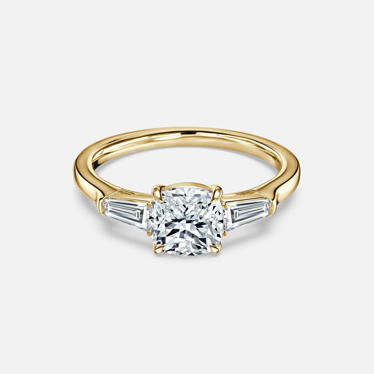 This beautiful yellow gold trilogy engagement ring is crafted with two tapered baguettes diamond sides and a hidden halo of sparkling diamonds. It is the perfect ring to signify a special and everlasting bond between two people. Handcrafted in Hatton Gardens, London. Centre Diamond Not Included Setting only