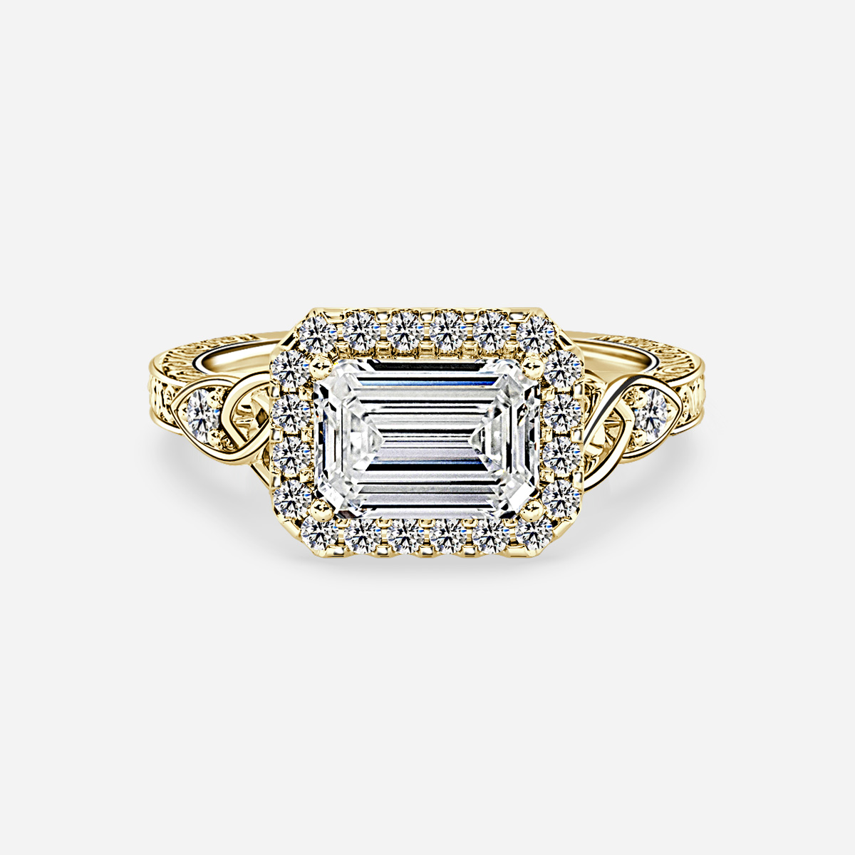 BROWSE READY TO SHIP RINGSThis elegant Celtic halo engagement ring features intricate carvings and is adorned with a dazzling diamond on each side. The perfect choice for those who appreciate timeless sophistication and unique design. Handcrafted in Hatton Garden, London Centre Diamond Not Included Setting Only