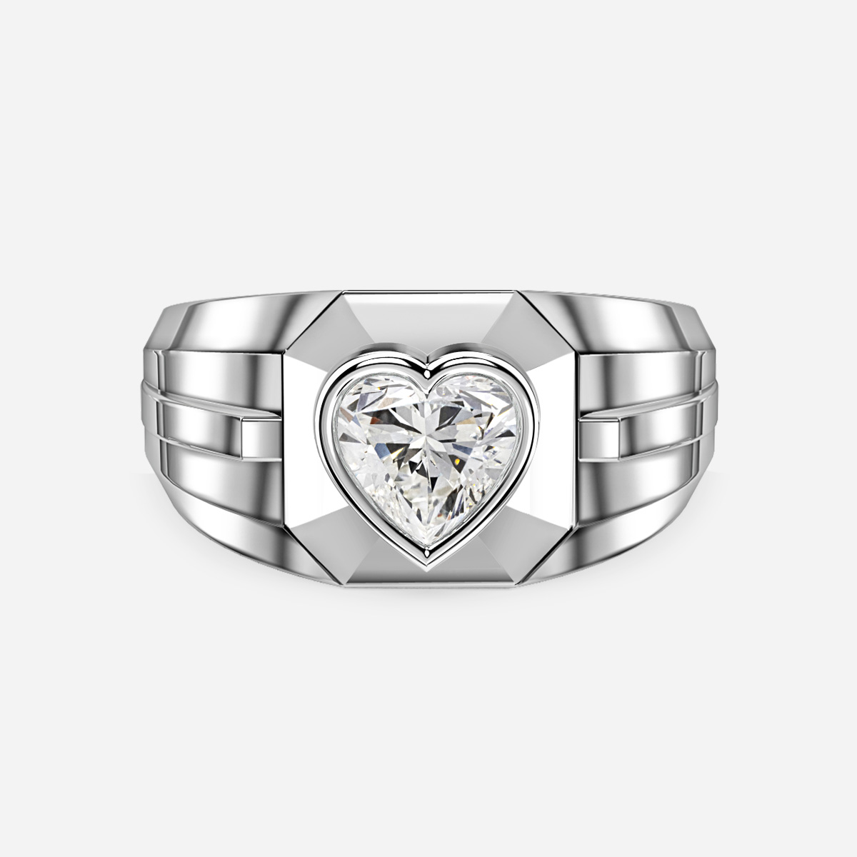 A white gold men's bezel set engagement ring features a center stone held in place by a metal rim that surrounds the stone, providing a sleek and modern look. This type of ring is a popular choice for men who prefer a minimalist design and want to showcase a single, stunning diamond or gemstone. Handcrafted in Hatton Garden, London Centre Diamond Not Included Setting Only