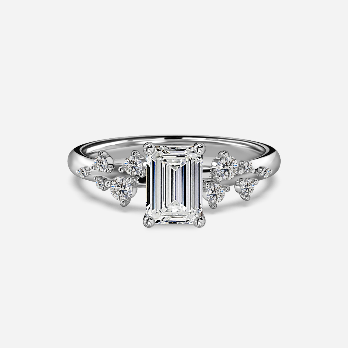 The Morning Star White Gold Cluster Engagement Ring showcases a band adorned with diamonds that elegantly diminish in size from the central diamond, set in gleaming white gold. The design beautifully accentuates the brilliance of the center diamond, creating a timeless and refined aesthetic. A symbol of enduring love and commitment. Handcrafted in Hatton Gardens, London. Centre Diamond Not Included Setting Only