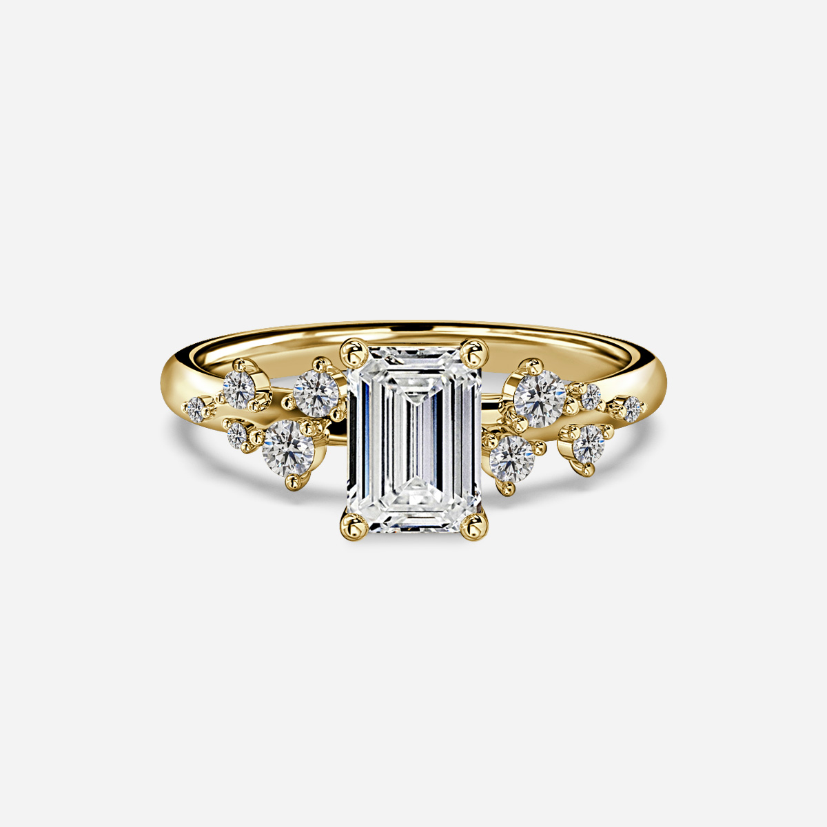 The Morning Star Yellow Gold Cluster Engagement Ring showcases a band adorned with diamonds that elegantly diminish in size from the central diamond, set in gleaming yellow gold. The design beautifully accentuates the brilliance of the center diamond, creating a timeless and refined aesthetic. A symbol of enduring love and commitment. Handcrafted in Hatton Gardens, London. Centre Diamond Not Included Setting Only