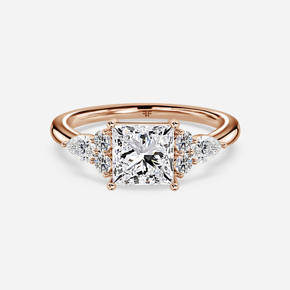 This rose gold round diamond trilogy engagement ring features a matching pair or pear shape diamonds and a couple of smaller round diamonds on either side of the centre stone. The side diamonds serve to enhance the sparkle of the ring. Handcrafted in Hatton Gardens, London. Centre Diamond Not Included Setting only