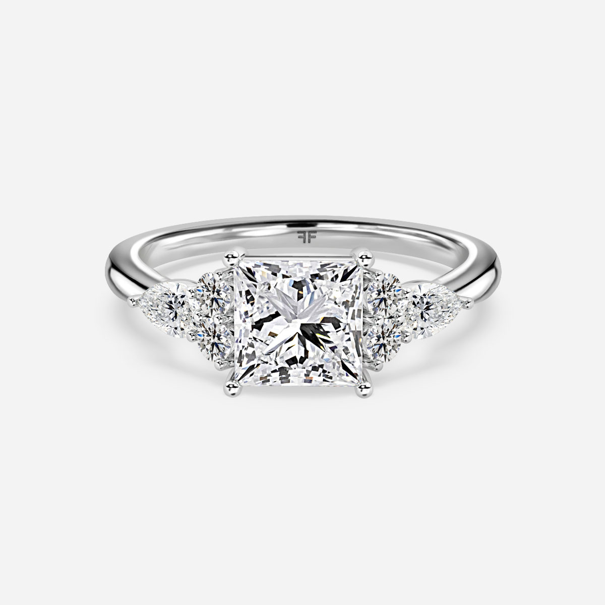 This white gold round diamond trilogy engagement ring features a matching pair or pear shape diamonds and a couple of smaller round diamonds on either side of the centre stone. The side diamonds serve to enhance the sparkle of the ring. Handcrafted in Hatton Gardens, London. Centre Diamond Not Included Setting only