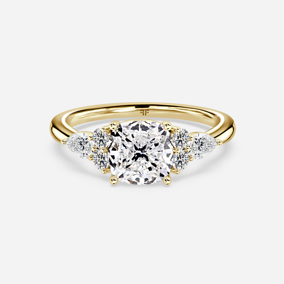 This yellow gold round diamond trilogy engagement ring features a matching pair or pear shape diamonds and a couple of smaller round diamonds on either side of the centre stone. The side diamonds serve to enhance the sparkle of the ring. Handcrafted in Hatton Gardens, London. Centre Diamond Not Included Setting only