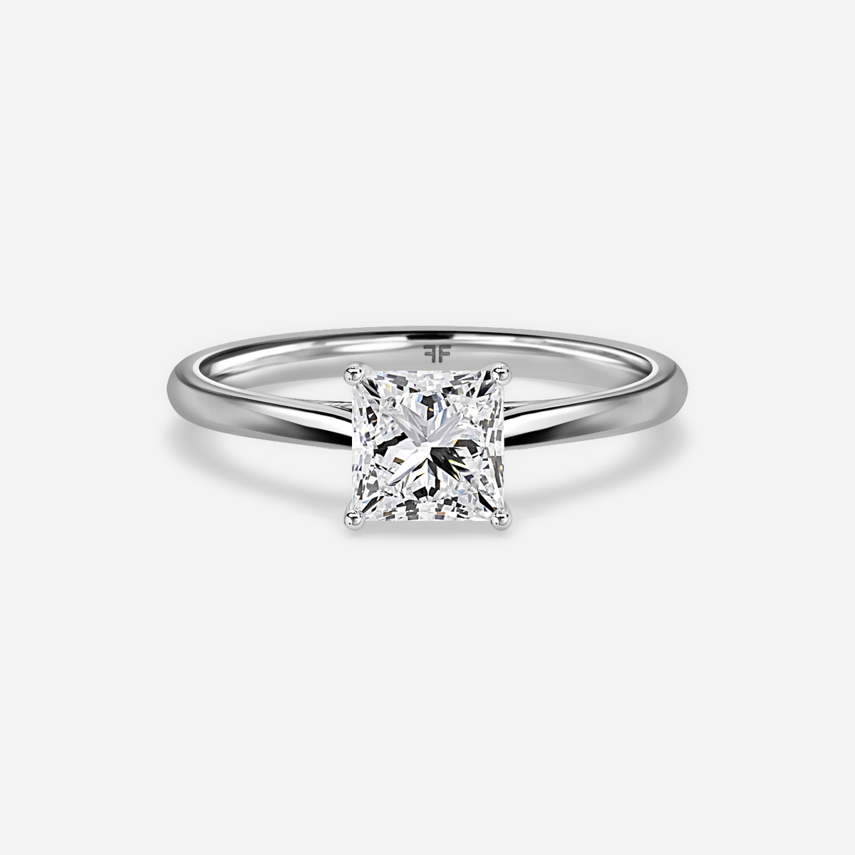 The solitaire tapered band engagement ring is a stunning symbol of love and commitment. Crafted from platinum and adorned with a center diamond, it is sure to capture the heart of your beloved. Handcrafted in Hatton Gardens, London. Setting only