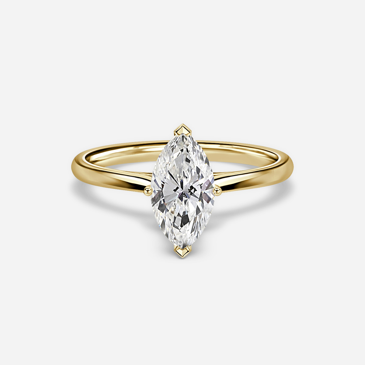 The solitaire tapered band engagement ring is a stunning symbol of love and commitment. Crafted from yellow gold and adorned with a center diamond, it is sure to capture the heart of your beloved. Handcrafted in Hatton Gardens, London. Setting only