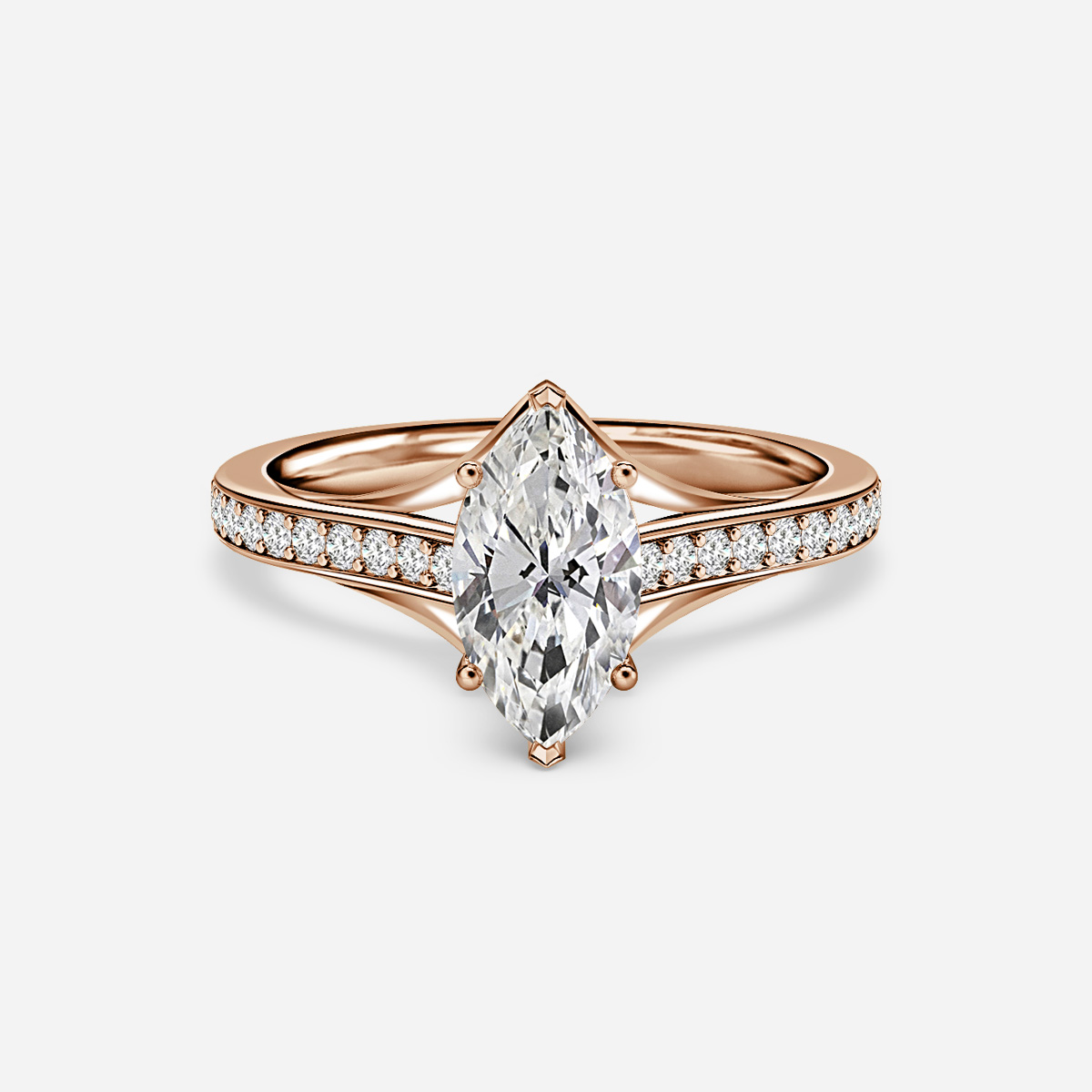BROWSE READY TO SHIP RINGSA rose gold cathedral design engagement ring in pave features in rose gold a raised setting that arches over the center stone, with multiple small stones set into the band in a pave setting style. This ring design resembles the architecture of a cathedral and adds a touch of elegance and sparkle to the ring. Handcrafted in Hatton Garden, London Centre Diamond Not Included Setting Only
