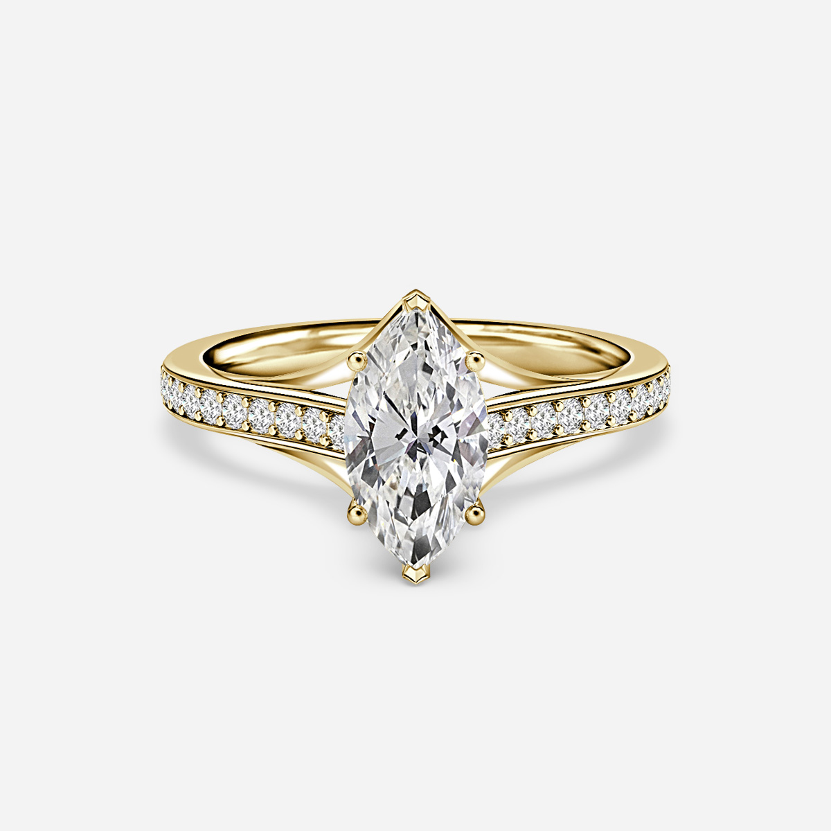 BROWSE READY TO SHIP RINGSA yellow gold cathedral design engagement ring in pave features a raised setting that arches over the center stone, with multiple small stones set into the band in a pave setting style. This ring design resembles the architecture of a cathedral and adds a touch of elegance and sparkle to the ring. Handcrafted in Hatton Garden, London Centre Diamond Not Included Setting Only