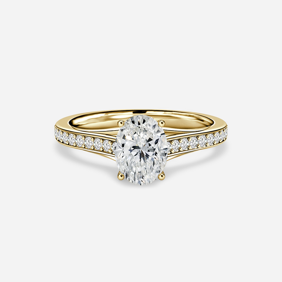 A yellow gold cathedral design engagement ring in pave features a raised setting that arches over the center stone, with multiple small stones set into the band in a pave setting style. This ring design resembles the architecture of a cathedral and adds a touch of elegance and sparkle to the ring. Handcrafted in Hatton Garden, London Centre Diamond Not Included Setting Only