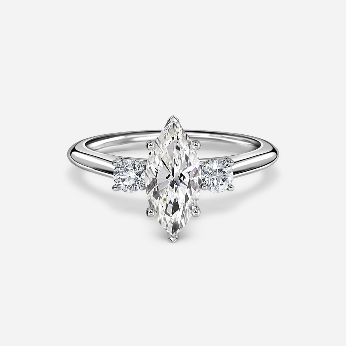 This platinum rohini trilogy engagement ring features petal claws sweeping upward to embrace two brilliant round diamond side stone that symbolize the past, present, and future tale of your relationship. Handcrafted in Hatton Garden, London Centre Diamond Not Included Setting Only