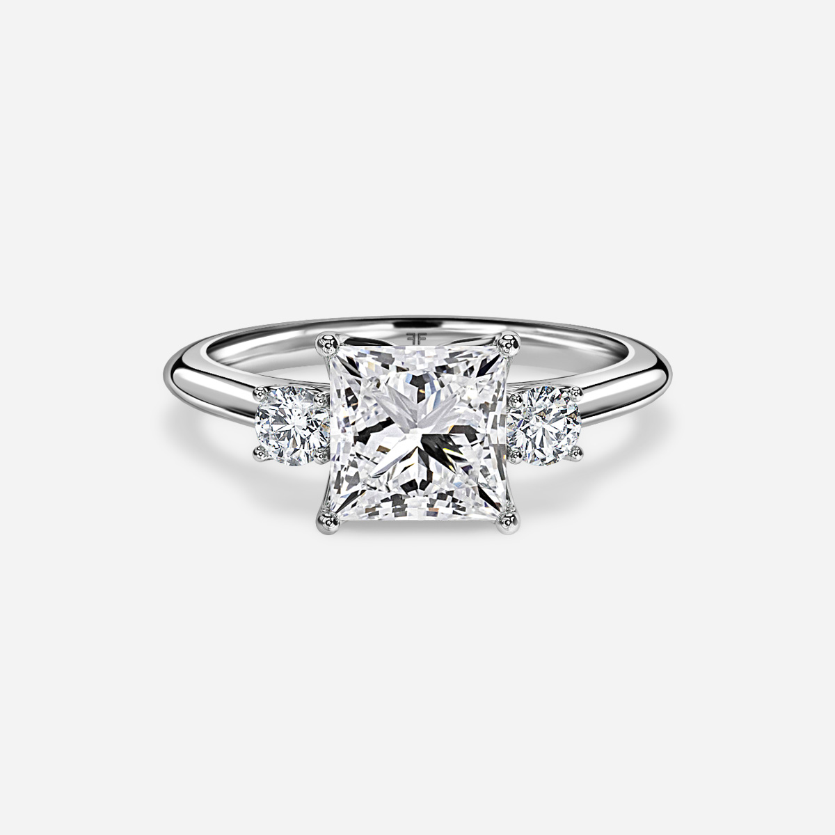 This platinum rohini trilogy engagement ring features petal claws sweeping upward to embrace two brilliant round diamond side stone that symbolize the past, present, and future tale of your relationship. Handcrafted in Hatton Garden, London Centre Diamond Not Included Setting Only