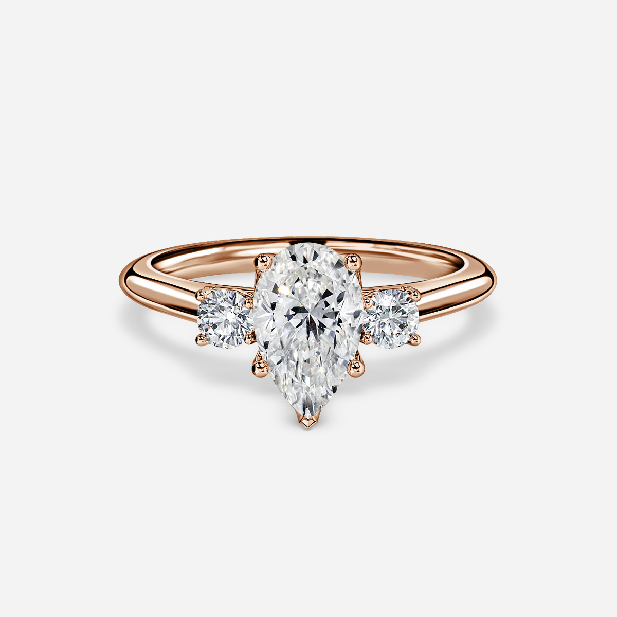 This rose gold rohini trilogy engagement ring features petal claws sweeping upward to embrace two brilliant round diamond side stone that symbolize the past, present, and future tale of your relationship. Handcrafted in Hatton Garden, London Centre Diamond Not Included Setting Only
