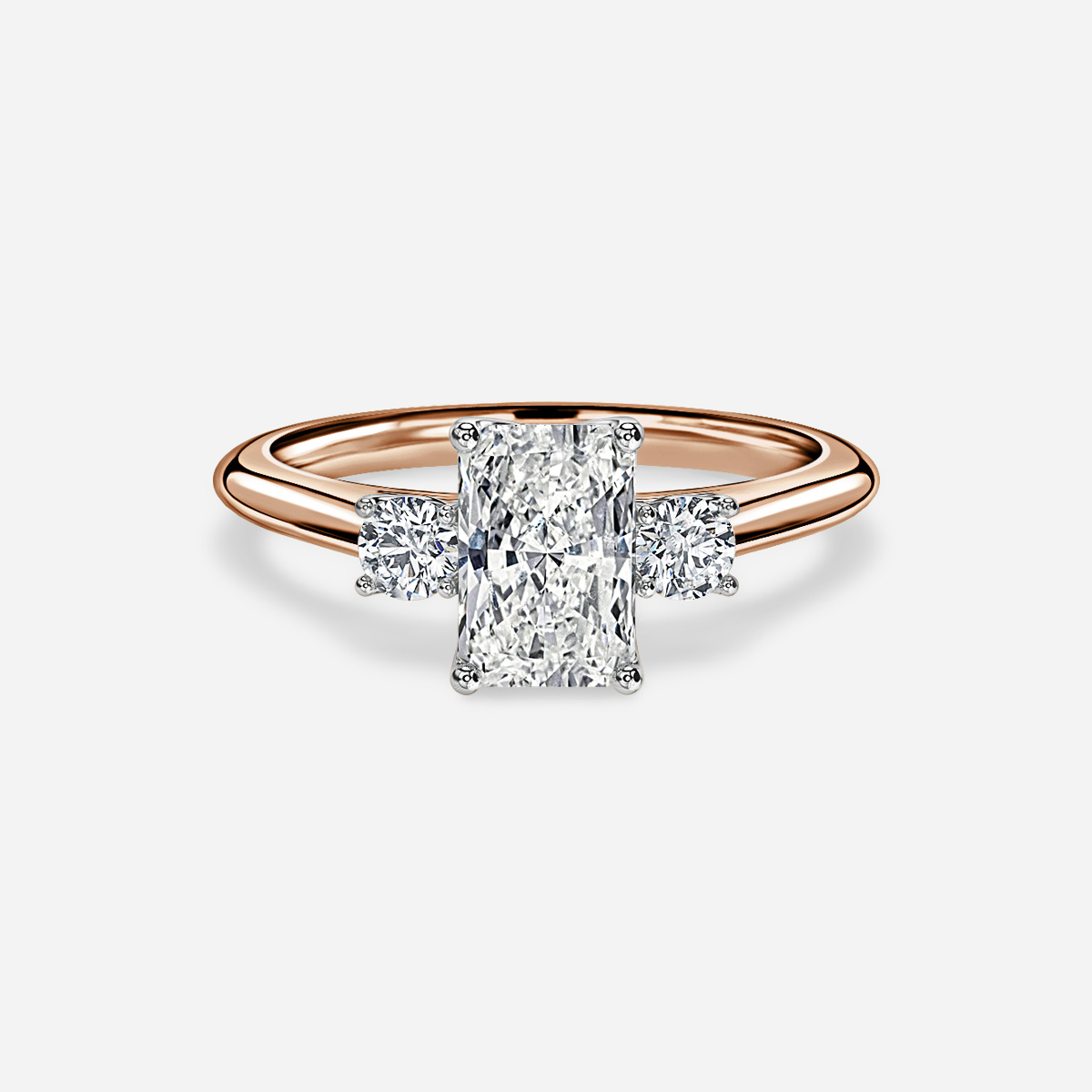 This rose gold two tone rohini trilogy engagement ring features petal claws sweeping upward to embrace two brilliant round diamond side stone that symbolize the past, present, and future tale of your relationship. Handcrafted in Hatton Garden, London Centre Diamond Not Included Setting Only