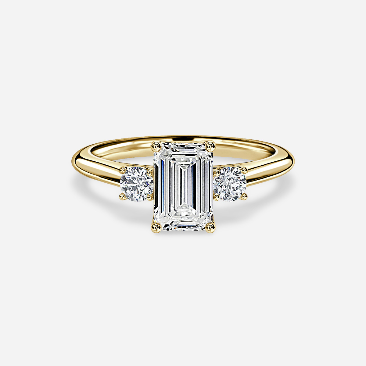 This yellow gold rohini trilogy engagement ring features petal claws sweeping upward to embrace two brilliant round diamond side stone that symbolize the past, present, and future tale of your relationship. Handcrafted in Hatton Garden, London Centre Diamond Not Included Setting Only