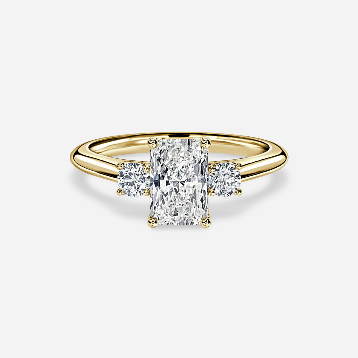 This yellow gold rohini trilogy engagement ring features petal claws sweeping upward to embrace two brilliant round diamond side stone that symbolize the past, present, and future tale of your relationship. Handcrafted in Hatton Garden, London Centre Diamond Not Included Setting Only