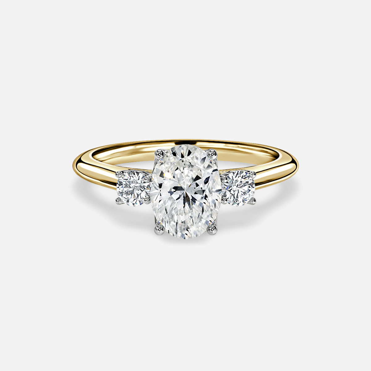 This yellow gold two tone rohini trilogy engagement ring features petal claws sweeping upward to embrace two brilliant round diamond side stone that symbolize the past, present, and future tale of your relationship. Handcrafted in Hatton Garden, London Centre Diamond Not Included Setting Only