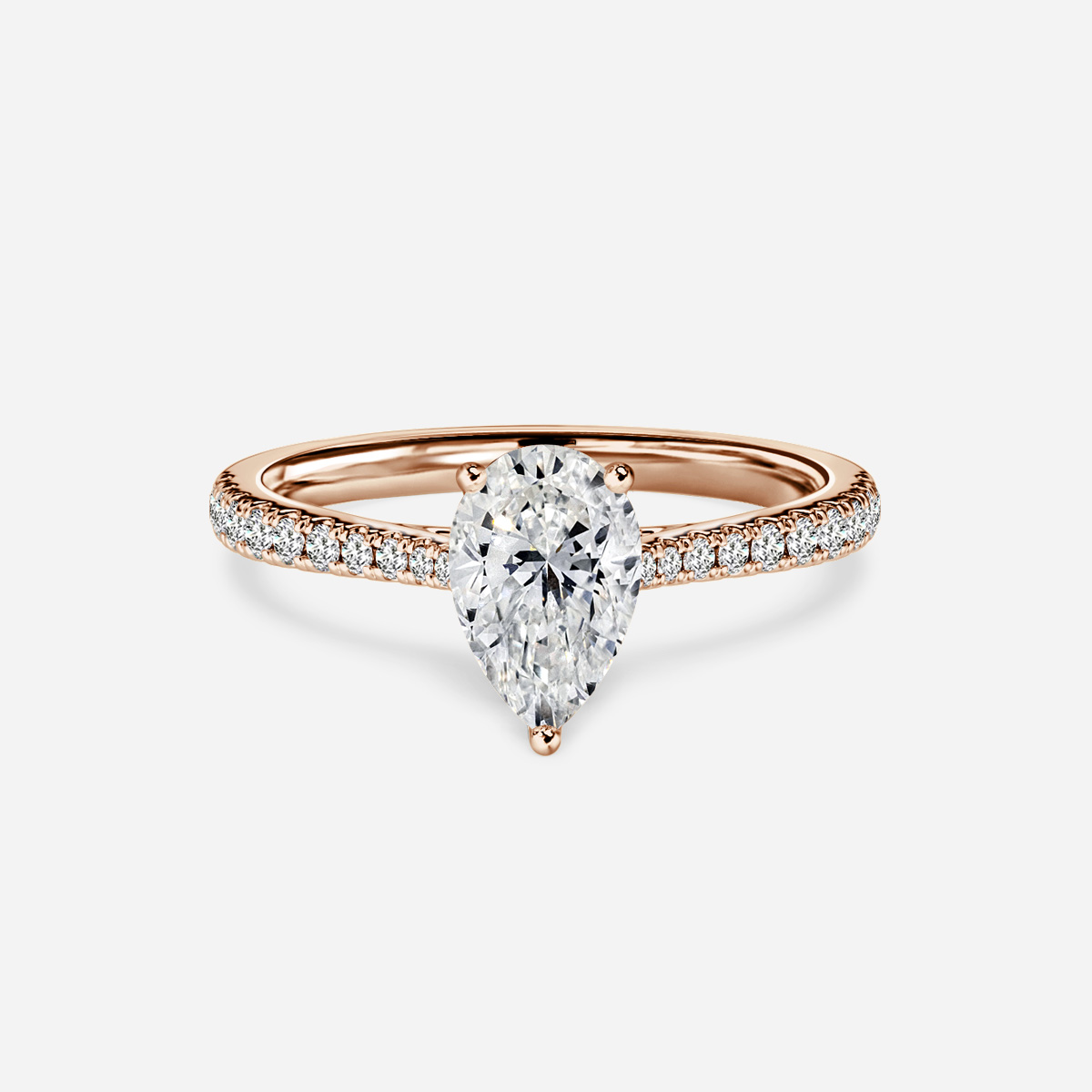 A rose gold micro pave diamond engagement ring features a sparkling round diamond in the center, accents along the shoulders, and a timeless design perfect for celebrating this special moment. Handcrafted in Hatton Garden, London Centre Diamond Not Included Setting Only