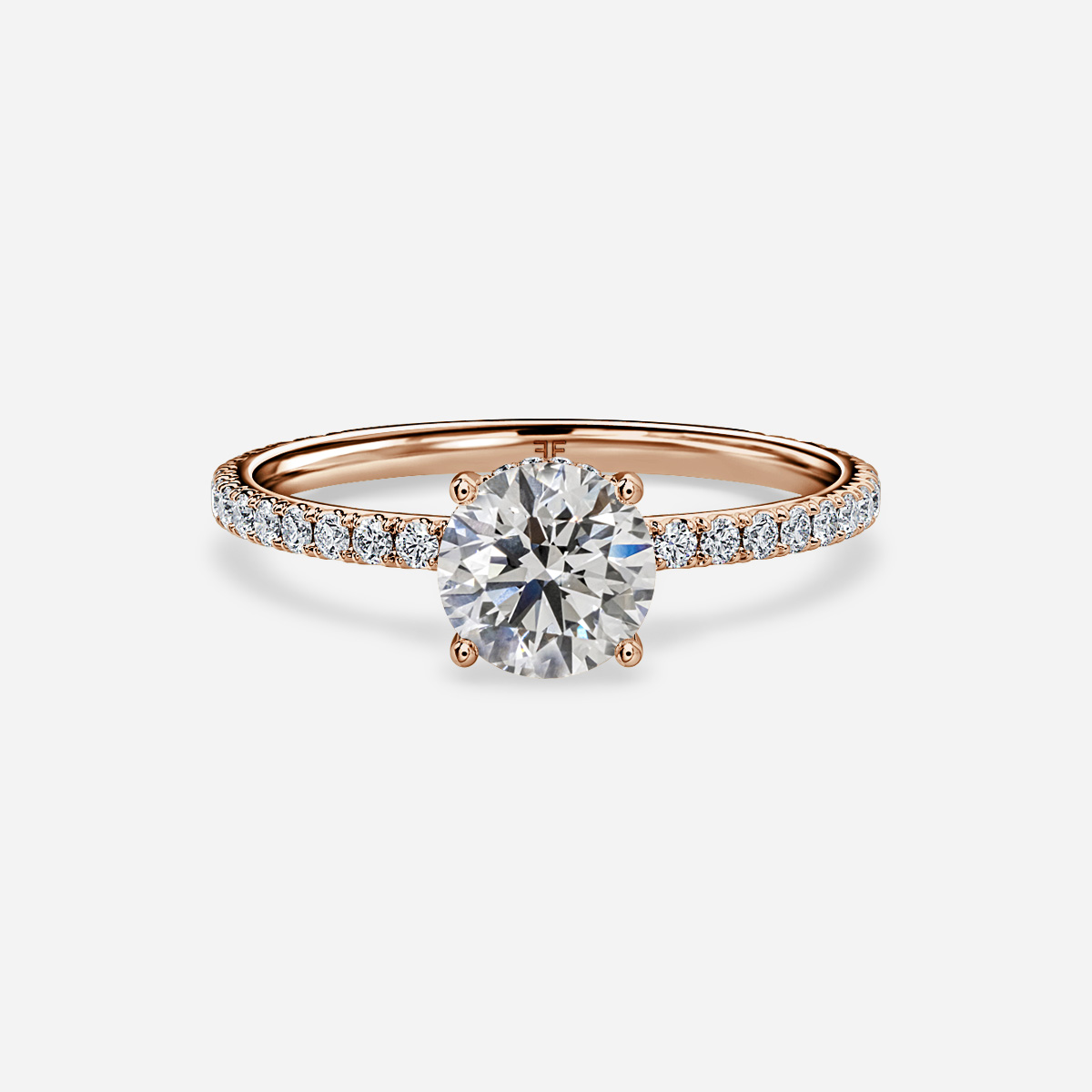 This hidden halo pave set rose gold engagement ring captivates your attention by showcasing a beautiful diamond in the center. Round cut diamonds are arranged in french pave on the delicate shank of the ring. Handcrafted in Hatton Garden, London Center Diamond Not Included Setting Only