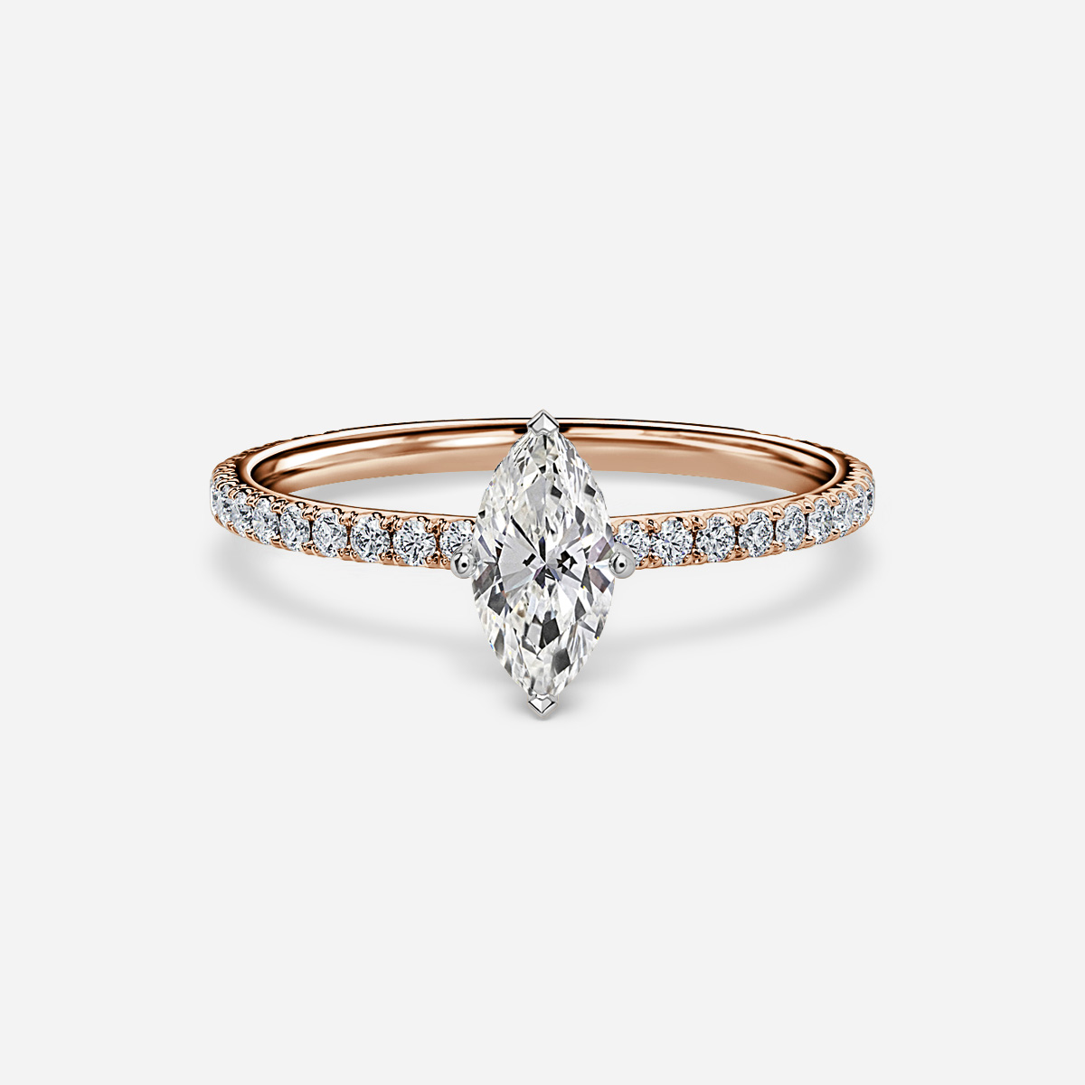 This hidden halo pave set rose gold two tone engagement ring captivates your attention by showcasing a beautiful  diamond in the center. Round cut diamonds are arranged in french pave on the delicate shank of the ring. Handcrafted in Hatton Garden, London Center Diamond Not Included Setting Only