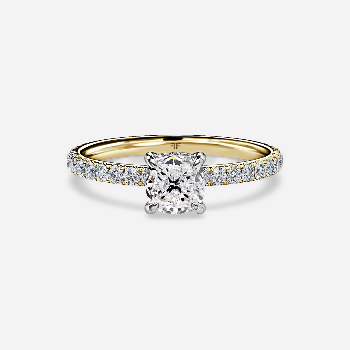 The two tone yellow gold micro pave diamond Danity engagement ring is an exquisite piece of craftsmanship featuring a sparkling combination of pave-set diamonds set in alternating precious metal tones. Handcrafted in Hatton Gardens, London. Centre Diamond Not Included Setting only