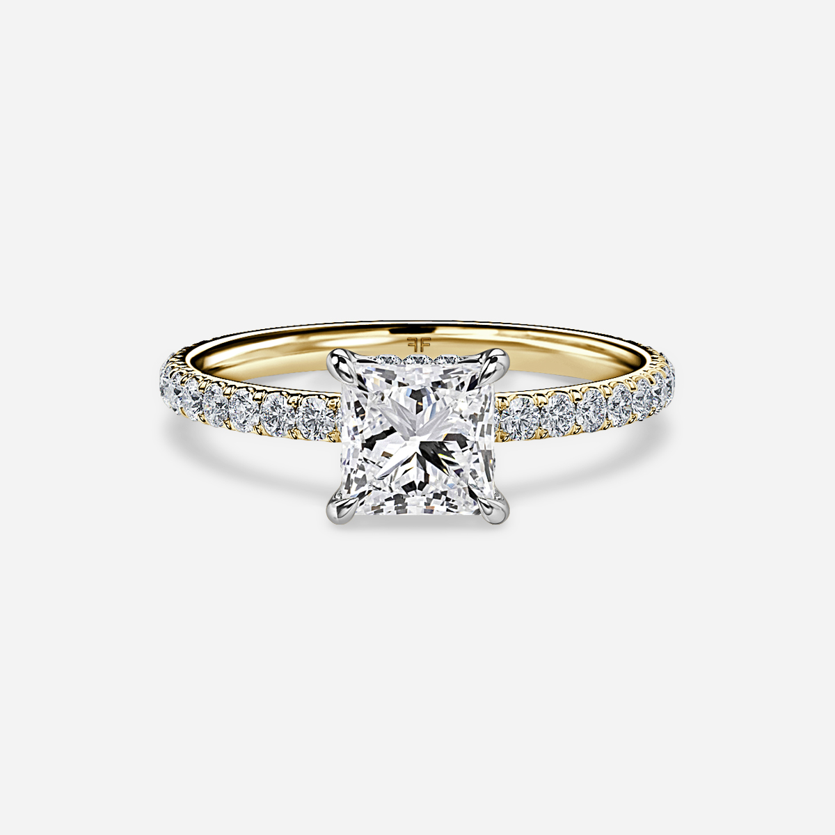 The two tone yellow gold micro pave diamond Danity engagement ring is an exquisite piece of craftsmanship featuring a sparkling combination of pave-set diamonds set in alternating precious metal tones. Handcrafted in Hatton Gardens, London. Centre Diamond Not Included Setting only