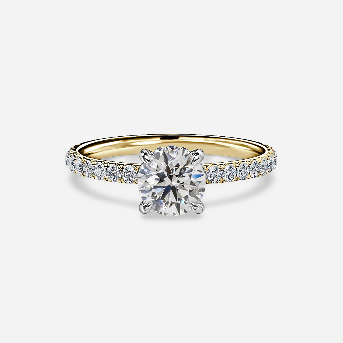 The two tone yellow gold micro pave diamond Danity engagement ring is an exquisite piece of craftsmanship featuring a sparkling combination of pave-set diamonds set in alternating precious metal tones. Handcrafted in Hatton Gardens, London. Centre Diamond Not Included Setting only