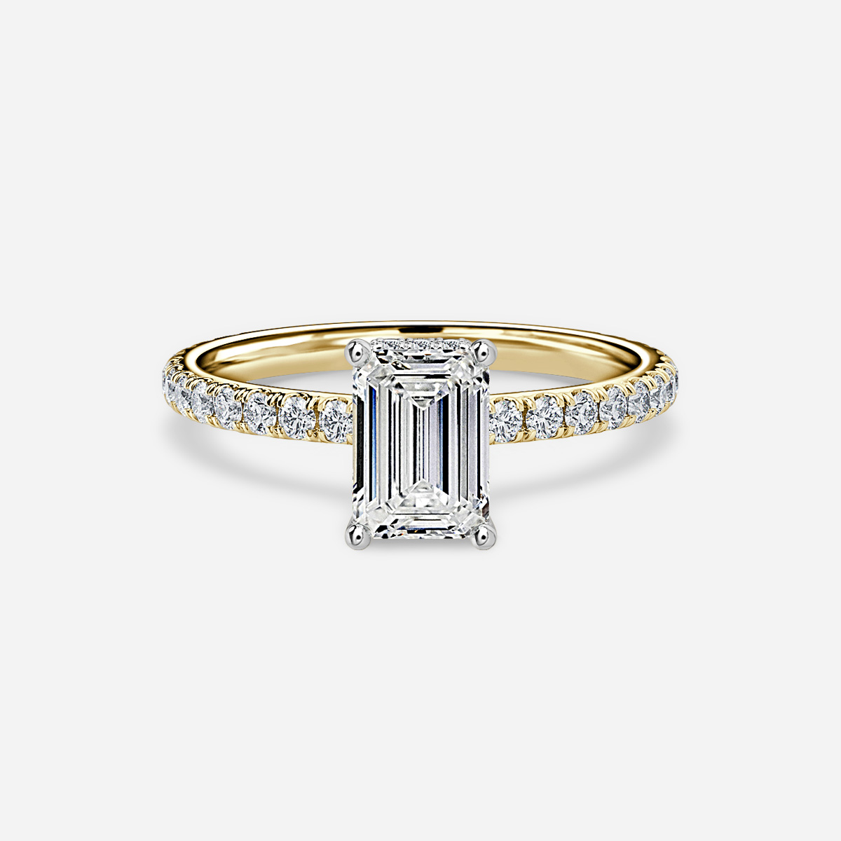 A yellow gold two tone hidden halo engagement ring featuring smaller diamonds wrapped around the prongs, beautifully combining modern style with timeless elegance. Handcrafted in Hatton Garden, London Center Diamond Not Included Setting Only