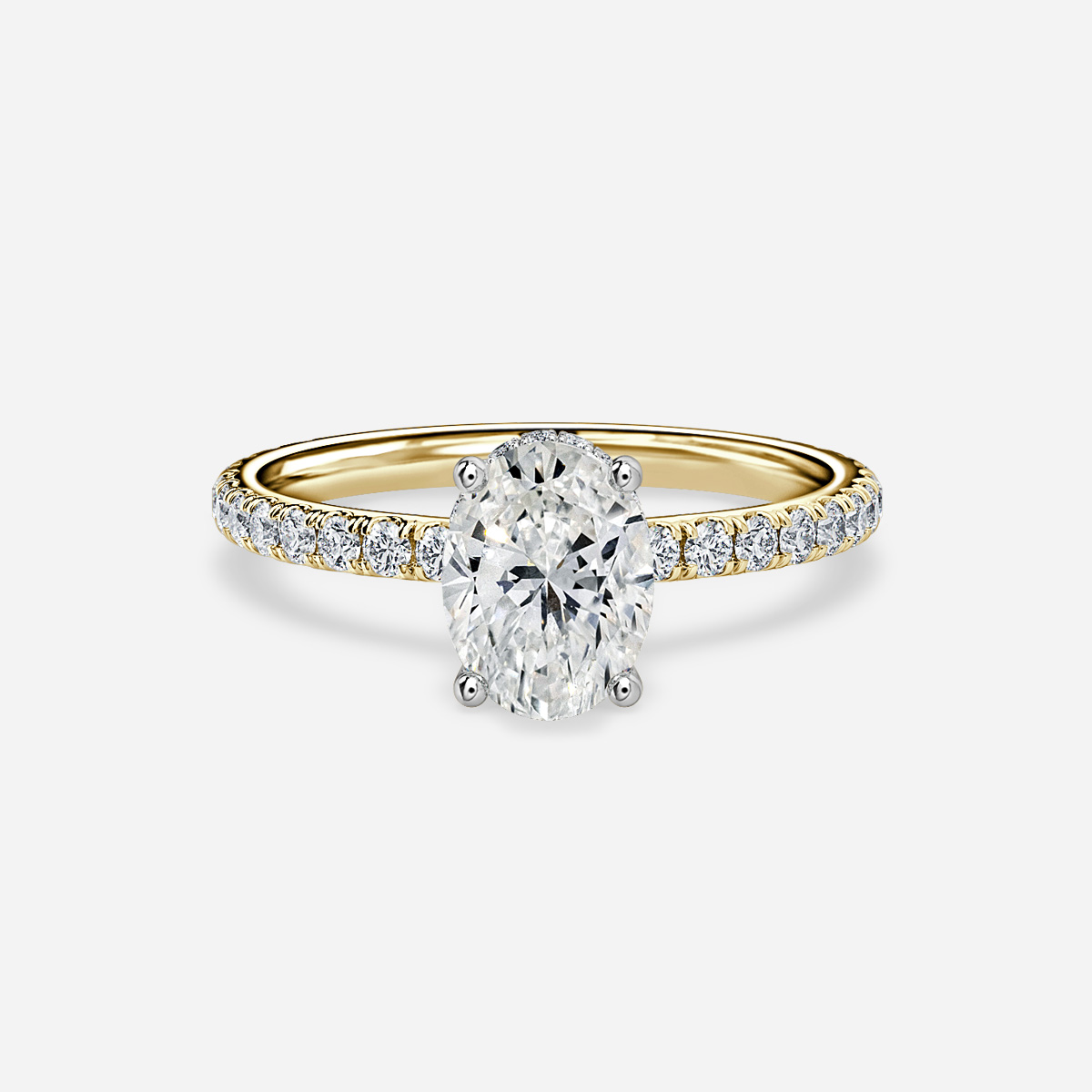 BROWSE READY TO SHIP RINGSA yellow gold two tone hidden halo engagement ring featuring smaller diamonds wrapped around the prongs, beautifully combining modern style with timeless elegance. Handcrafted in Hatton Garden, London Center Diamond Not Included Setting Only