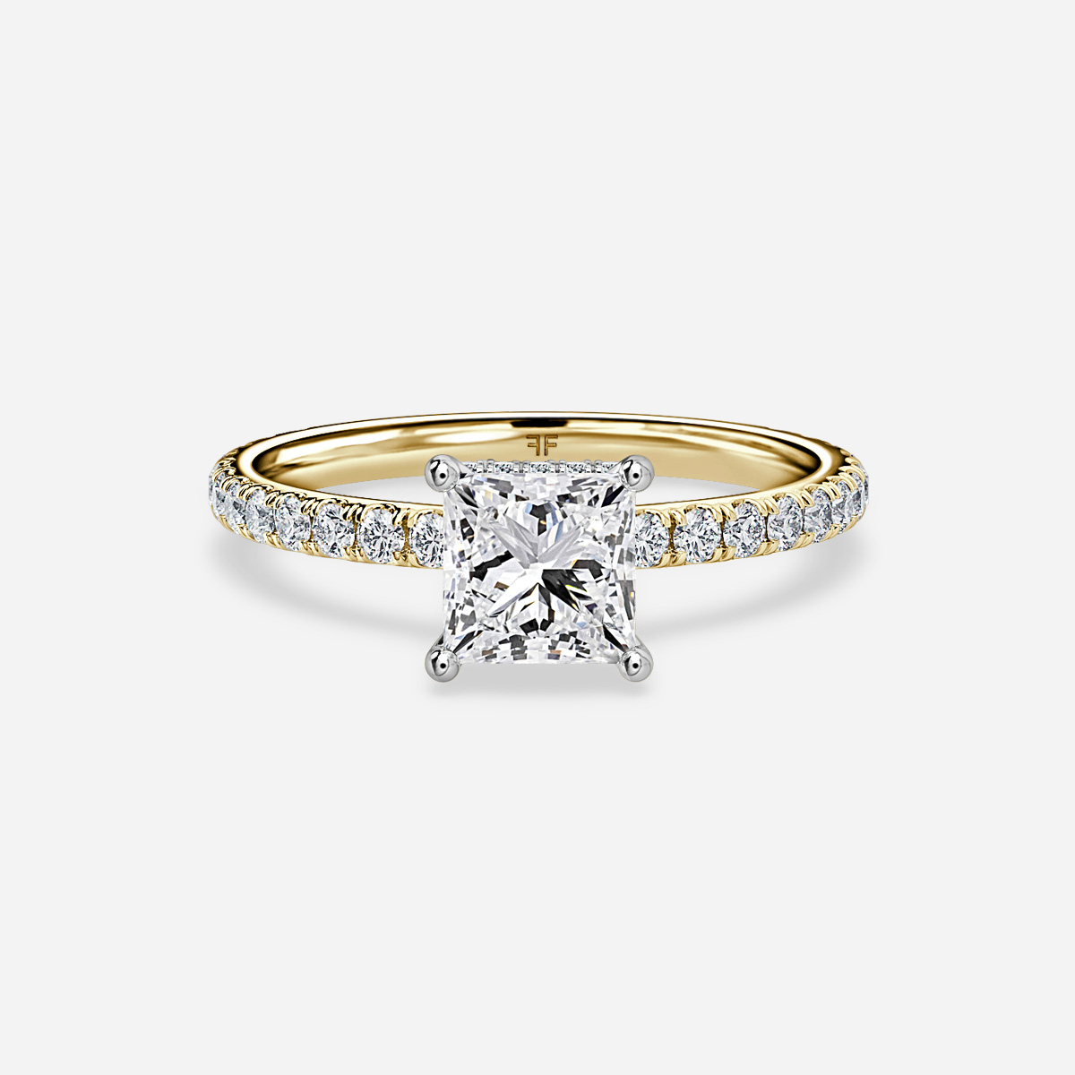 A yellow gold two tone hidden halo engagement ring featuring smaller diamonds wrapped around the prongs, beautifully combining modern style with timeless elegance. Handcrafted in Hatton Garden, London Center Diamond Not Included Setting Only