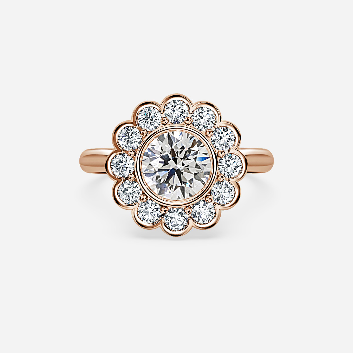 This rose gold cluster ring is defined by its ornamental, lace-like detail that lends itself to band with a floral design. Handcrafted in Hatton Garden, London Centre Diamond Not Included Setting Only