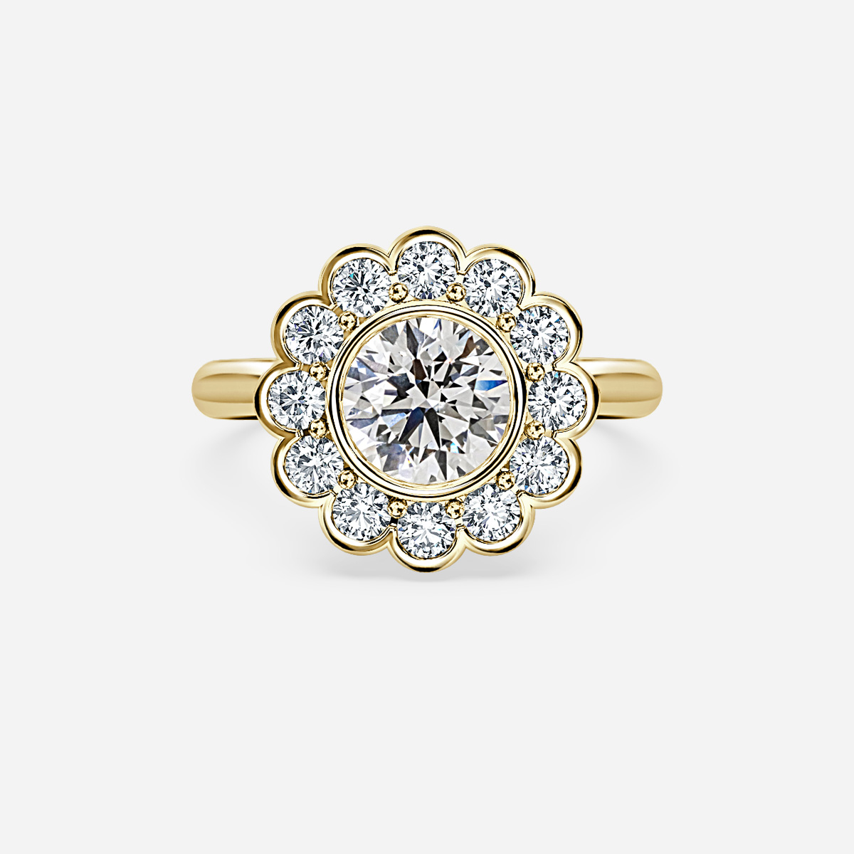 This yellow gold cluster ring is defined by its ornamental, lace-like detail that lends itself to band with a floral design. Handcrafted in Hatton Garden, London Centre Diamond Not Included Setting Only