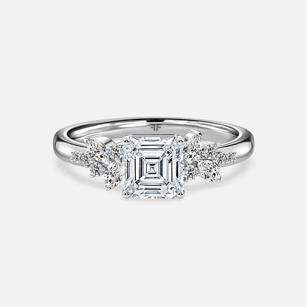 The flower pattern engagement ring in platinum features a stunning round and marquise diamond on each side of the center stone. The arrangement creates a beautiful and intricate design that is both timeless and elegant. This engagement ring is the perfect symbol of love and commitment to last a lifetime. Handcrafted in Hatton Garden, London Centre Diamond Not Included Setting Only