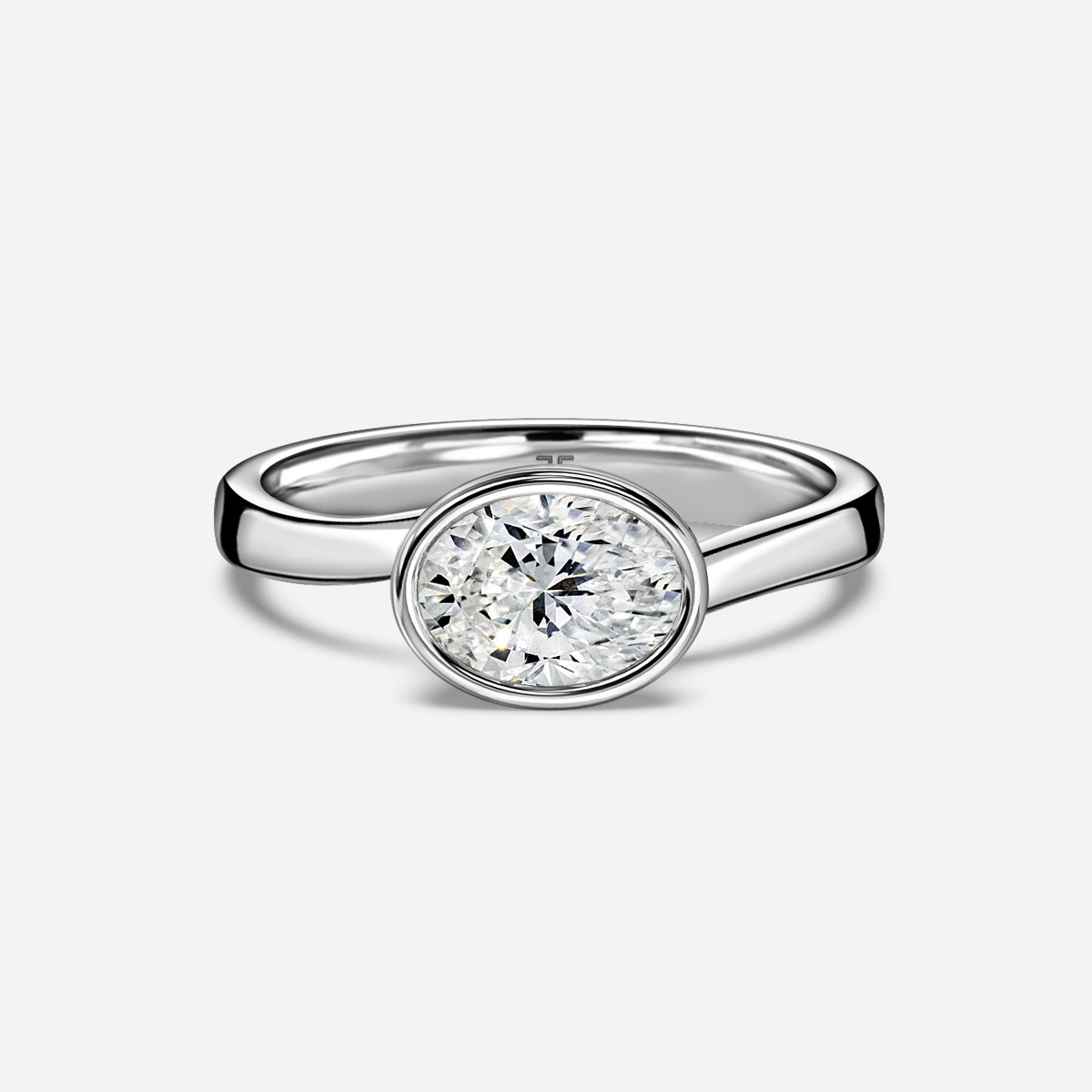 The Sydney White Gold Solitaire Engagement Ring showcases a timeless center diamond, beautifully embraced by a white gold band that elegantly sweeps around from both sides, creating a sophisticated twist on a classic design. Handcrafted in Hatton Garden, London