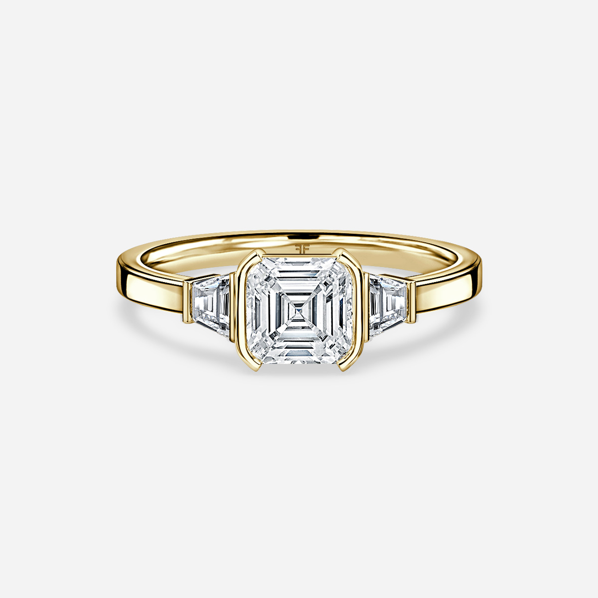 The Theia Yellow Gold Semi Bezel Set Trapezoid Trilogy Engagement Ring elegantly combines modern design with timeless sophistication, featuring a striking trapezoid-cut centerpiece flanked by two complementary stones, all securely embraced by a yellow gold semi-bezel setting. Handcrafted in Hatton Gardens, London. Centre Diamond Not Included Setting Only