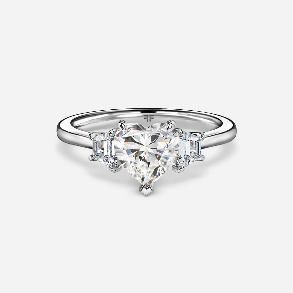 This gorgeous platinum trilogy engagement ring features three stones that represent the past, present, and future. Its timeless beauty is accentuated by two trapezoid stones on each side for a truly unique look. Handcrafted in Hatton Gardens, London. Centre Diamond Not Included Setting only