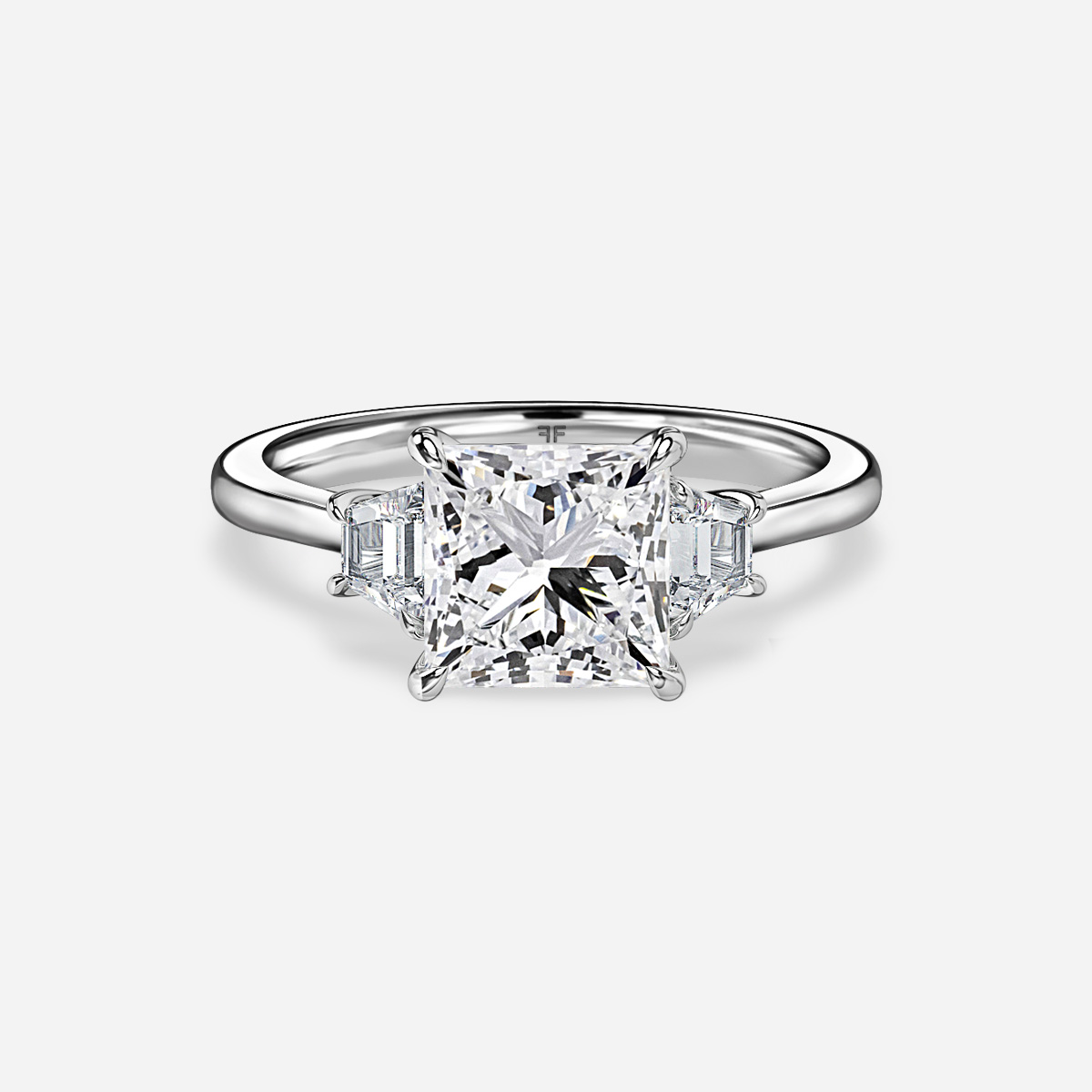 This gorgeous platinum trilogy engagement ring features three stones that represent the past, present, and future. Its timeless beauty is accentuated by two trapezoid stones on each side for a truly unique look. Handcrafted in Hatton Gardens, London. Centre Diamond Not Included Setting only